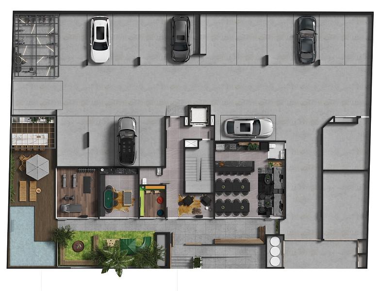 • Fachada com revestimentos nobres: brises em alumínio, cerâmica e ACM, garantindo elegância, valorização e baixa manutenção.